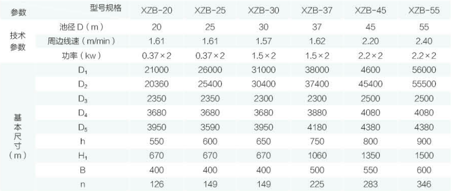 XZB型吸泥機一般用于大型(一般指流量大于500m3/h)    污水處理工程的幅流式沉淀池,特別適用于二沉池池底污 泥的刮集及外排。池形一般采用中心進水、周邊出水、中 心排泥,池底可不設坡度(平底結構),二沉池使用尤為廣 泛。水面浮渣、浮沫等雜物可由浮渣刮集裝置刮排至池外 渣坑或渣斗。靜壓排泥依靠各個管口閥門,調節流量流至 中心泥缸直接外排。虹吸排泥主要是利用真空泵抽真空進 行二次虹吸提升排泥力矩變化范圍較大的場合,可采用帶力矩保護裝置的軸裝 式減速機。